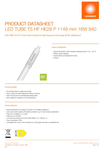 LED TUBE T5 HF HE14 PERFORMANCE 549 mm 7W 840 | G5 | 7 W | 40…70 V | 60000 h | 1050 lm | 14 W | 190 ° | No |