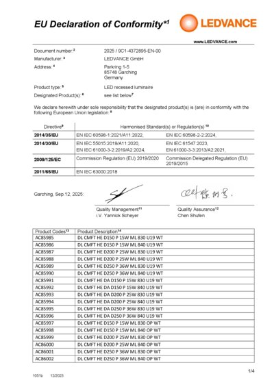 DL CMFT HE D150 P 15W ML 830 OP WT | 15 W / 12 W / 10 W | 100000 | 95 ° | 2025 lm / 1680 lm / 1400 lm | No |