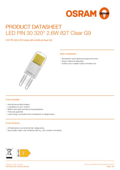 LED PIN 30 320° 2.6W 827 Clear G9 | G9 | 2.6 W | 220…240 V | 15000 h | 320 lm | 30 W | 320 ° | No |