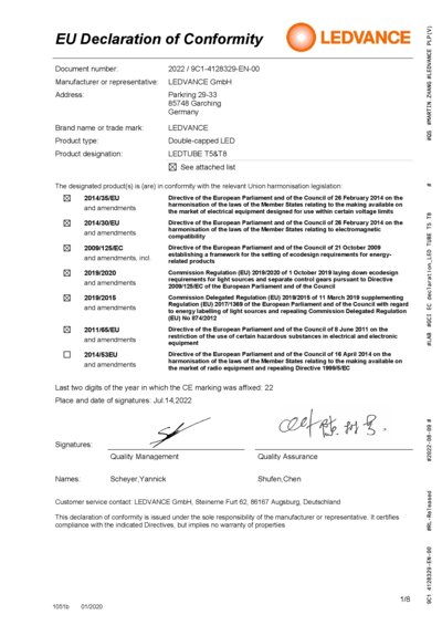 | Product remark | Single sided LED TUBE (one-sided DC input ) complying with safety requirement acc. IEC 62776:2014. Safety protection against electrical shock in misuse (ECG/CCG/Mains operation). |