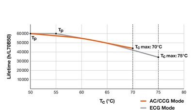 2) In operation with CCG/AC. Tp: 55°C in ECG operation. / Tp rated. Tp point coincides with Tc point - marked on device