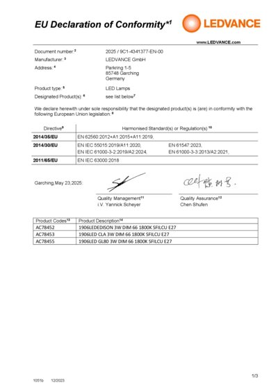 | Product remark | All technical parameters apply to the entire lamp, Due to the complex production process for light-emitting diodes, the typical values shown for the technical LED parameters are purely statistical values that do not necessarily match the actual technical parameters of each individual product, which can vary from the typical value |